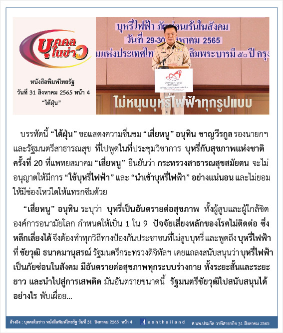2565/08/31 บุคคลในข่าว อนุทิน ไม่นำเข้าบุหรี่ไฟฟ้า