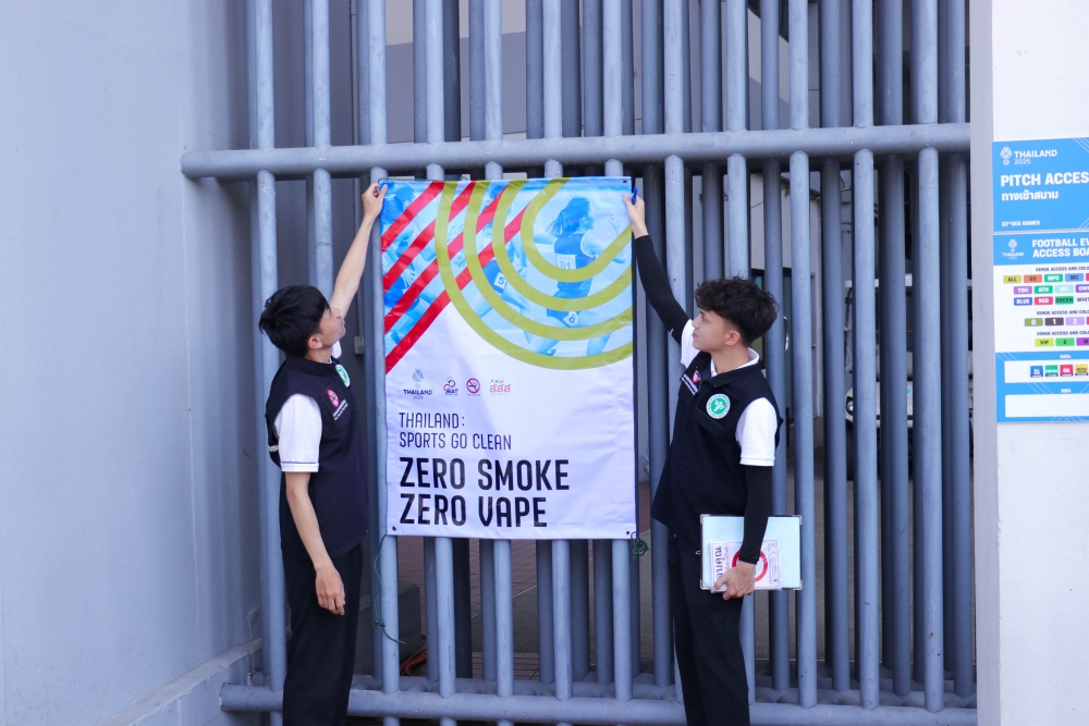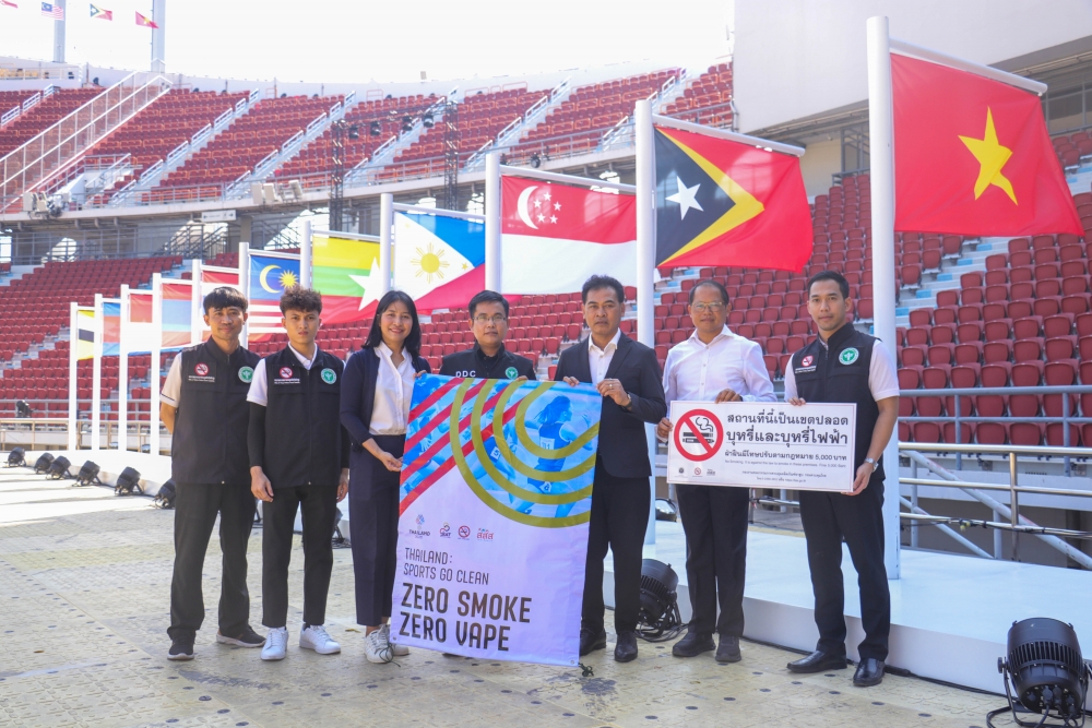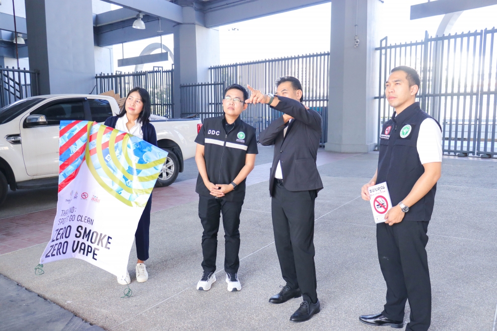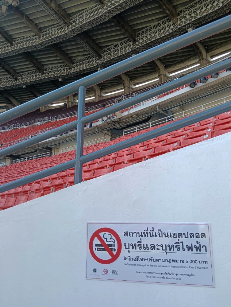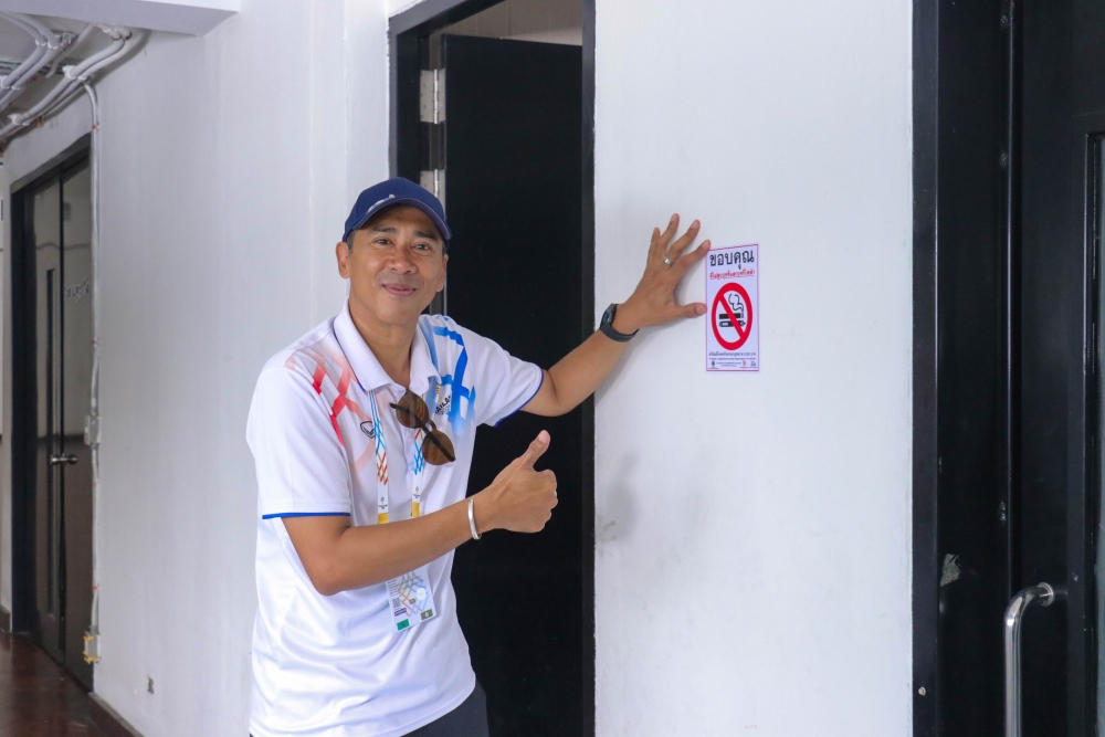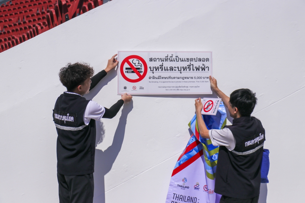 Today, the Action on Smoking and Health Foundation, in collaboration with the Tobacco Product Control Committee Office, Department of Disease Control, Ministry of Public Health—led by Mr. Jirawat Yoosabai, Deputy Director of the Tobacco Product Control Committee Office, and Ms. Wanlapa Kaewsri, Program Executive of the Action on Smoking and Health Foundation—inspected the sites and installed "No Smoking and E-Cigarette" signs. This declares Rajamangala National Stadium and all SEA Games competition areas as 100% smoke-free zones.
