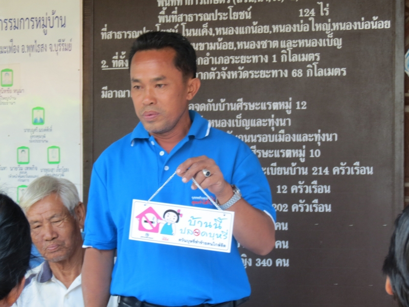 วันที่ 11 มีนาคม 2559 มูลนิธิรณรงค์เพื่อการไม่สูบบุหรี่ ในโครงการพัฒนาสมรรถนะและขยายเครือข่าย อสม. เพื่อทำบ้านในชุมชนให้ปลอดบุหรี่ นำโดย ผศ.กรองจิต วาทีสาธกกิจ และนางสุพฤติยา เริงจรัล ได้ลงพื้นที่ติดตามให้กำลังใจ ในชุมชน ม.3 บ้านศีรษะแรต ต.พุทไธสง อ.พุทไธสง จ.บุรีรัมย์ โดยได้พบกับผู้ใหญ่บ้าน นายสุนิทชัย หนูมา และคณะกรรมการหมู่บ้าน อสม. ประชาชน ได้ติดตามการประกาศนโยบายห้ามสูบบุหรี่ในชุมชนและในบ้านเป็นเขตปลอดบุหรี่ พร้อมรับฟังการแบ่งปันประสบการณ์ของ อสม. และบุคคลที่เลิกบุหรี่ได้ ทั้งนี้ได้มอบป้าย “บ้านนี้ปลอดบุหรี่” และผู้ใหญ่บ้านนำขบวนไปติดตามบ้านต่างๆที่ร่วมโครงการด้วย