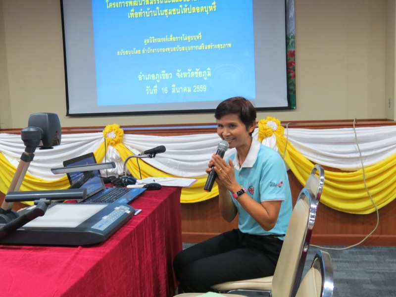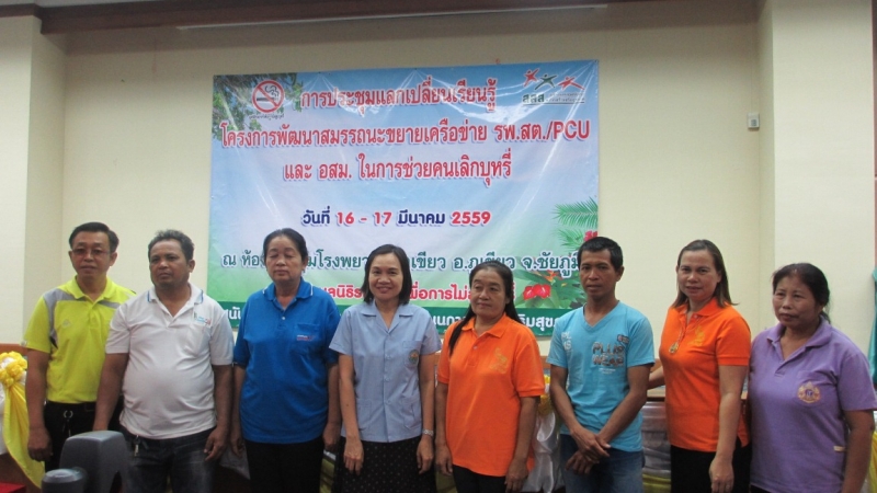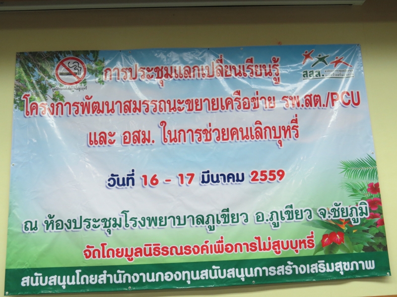 วันที่ 16 มีนาคม 2559 ณ ห้องประชุมโรงพยาบาลภูเขียว อ.ภูเขียว จ.ชัยภูมิ มูลนิธิรณรงค์เพื่อการไม่สูบบุหรี่ ในโครงการพัฒนาสมรรถนะและขยายเครือข่าย อสม. เพื่อทำบ้านในชุมชนให้ปลอดบุหรี่ ดำเนินการจัดถอดบทเรียนรายอำเภอครั้งที่ 1 โดยมี ผศ.กรองจิต วาทีสาธกกิจ และนางวราภรณ์ สระประทุม เป็นผู้ดำเนินรายการถอดบทเรียนติดตามผลการดำเนินงานโครงการ ในรอบเช้า เป็นเจ้าหน้าที่ รพ.สต. / PCU. จาก 9 แห่ง ทุกแห่งใช้โครงสร้าง 5A ถนนปชต ในการช่วยให้ผู้ป่วยเลิกบุหรี่และส่งต่อให้ อสม. ติดตาม พร้อมเป็นพี่เลี้ยงให้กับอสม.ในการทำงานด้วย