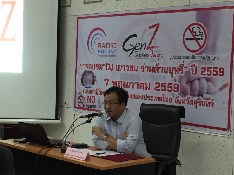 วันนี้ (7 พ.ค.2559) สถานีวิทยุกระจายเสียงแห่งประเทศไทย จังหวัดสุรินทร์ ร่วมกับ มูลนิธิรณรงค์เพื่อการไม่สูบบุหรี่ จัดอบรม "DJ เยาวชน ร่วมต้านบุหรี่" ปี 2559 โดยมีนายณรงค์ รักร้อย รองผู้ว่าราชการจังหวัดสุรินทร์ เป็นประธานเปิดงาน ทั้งนี้เพื่อเป็นการอบรมแกนนำเยาวชน Gen Z ให้เป็นดีเจเยาวชนรุ่นใหม่ และปกป้อง Gen Z จากบุหรี่ ให้เยาวชนช่วยปกป้องเยาวชน รวมถึงสร้างแกนนำ Gen Z Gen Strong : ไม่สูบ ในจังหวัดสุรินทร์
