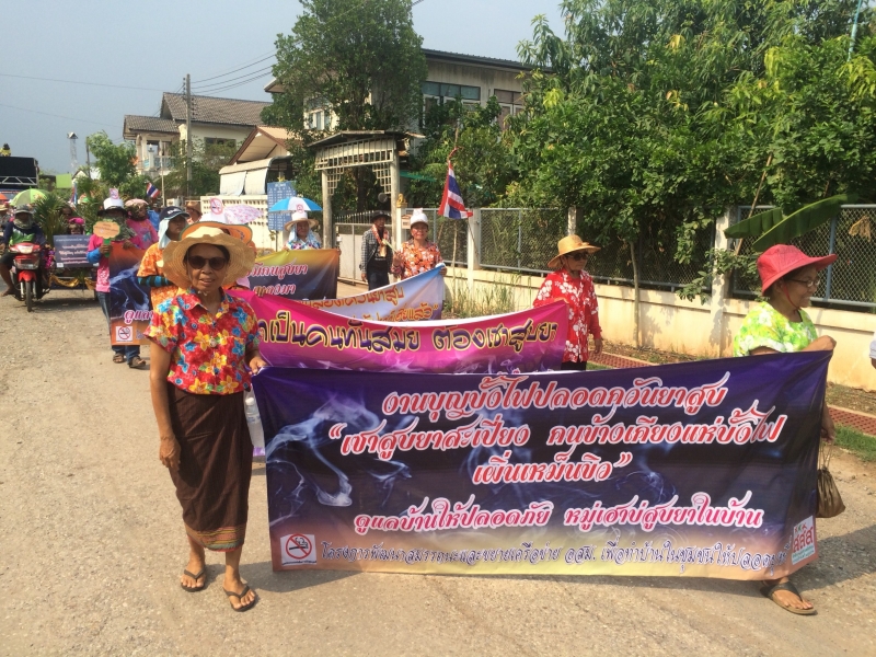 ในวันที่ 7 พฤษภาคม 2559 ที่ผ่านมา รพ.สต.หนองบัวพรม ร่วมกับมูลนิธิรณรงค์เพื่อการไม่สูบบุหรี่ ได้จัดโครงการกิจกรรมรณรงค์ งานบุญบั้งไฟร่วมใจรณรงค์ทำบ้านปลอดบุหรี่ ขึ้น ในโครงการพัฒนาสมรรถนะและขยายเครือข่าย อสม. เพื่อทำบ้านในชุมชนให้ปลอดบุหรี่ โดยบูรณาการงานรณรงค์เผยแพร่ประชาสัมพันธ์ร่วมกับประเพณีงานบุญบั้งไฟประจำปีของชุมชน สถานที่ ณ ศาลากลางหมู่บ้าน หมู่ 4 ต.หนองคอนไทย อ.ภูเขียว จ.ชัยภูมิ เพื่อให้ประชาชนทั่วไปได้ตระหนักถึงพิษภัยบุหรี่ และการทำบ้านให้ปลอดบุหรี่ จัดเดินขบวนรณรงค์รอบหมู่บ้าน มีผู้เข้าร่วม 6 หมู่บ้าน ได้แก่ ผู้นำชุมชน อสม. และประชาชนทั่วไป ถือป้ายข้อความประชาสัมพันธ์ที่คนในชุมชนร่วมกันคิดและแต่งข้อความขึ้นมาเอง ดังนี้ 1.บุญบั้งไฟนี้ดี บ่มีคนสูบยา ฝนกะเทลงมา เทลงมา 2. เซาสูบยาสะเปี่ยง คนข้างเคียงแห่บั้งไฟเผิ่นเหม็นขิว 3. อยากเป็นคนทันสมัยต้องเซาสูบยา 4. เลิกบ่ยากดอกยาสูบน่ะ แค่อ้าปากก็เฮี่ยแล้ว