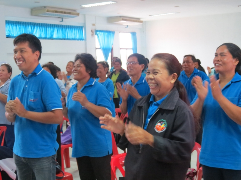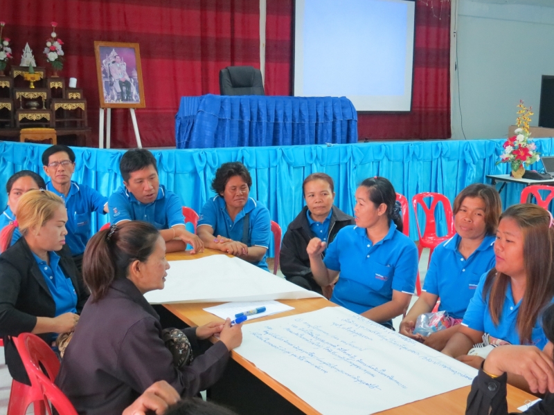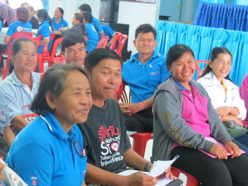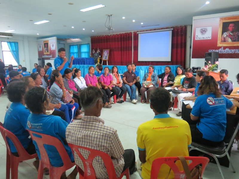 มีการแบ่งกลุ่ม อสม. นำโดยเจ้าหน้าที่ รพ.สต. ต่างร่วมระดมความคิด และเล่าประสบการณ์การดำเนินงานช่วยให้คนเลิกบุหรี่ที่ผ่านมา ในครั้งนี้มี อสม. ที่ชักชวนสามีเลิกสูบบุหรี่ อสม.นางประไพ ทองพุย จากรพ.สต.บ้านฝาย มีปัญหาบอกสามีที่สูบบุหรี่ไม่ค่อยได้ เลยไม่ได้ตามหลังคาเรือนอื่น เพราะจะถูกบอกย้อนกลับว่าให้สามีเลิกให้ได้ก่อน ดูแล 18 หลังคาเรือน มีคนสูบอยู่ 5 คน ตอนนี้ทำงานได้เต็มที่เพราะสามีเลิกบุหรี่แล้ว ช่วงที่สามีเลิกบุหรี่ มีอาการเหนื่อย สั่น บางครั้งร้องเสียงดังลั่น เหมือนลงแดง บอกสามีให้อดทน สู้ๆ เมื่อให้เขียนรายงานทำไมถึงเลิกได้ สามีบอกรำคาญเมีย ลูกชายก็บอกว่าจะไม่สูบบุหรี่เหมือนพ่อ แต่ก่อนกลิ่นตัวแรง ตอนนี้เข้าใกล้กลิ่นตัวหอมแล้ว สามีเลิกได้ 2 แล้ว อสม.ดีใจมาก บอกสามีถ้าเลิกบุหรี่จะซื้อเสื้อให้สัก 10 ตัว ตอนนี้ไม่มีตังค์ซื้อให้แล้ว นึกว่ามีจะเลิกไม่ได้ หมอแดง (เจ้าหน้าที่ รพ.สต.) เอาเสื้อให้ ใส่แล้วโก้