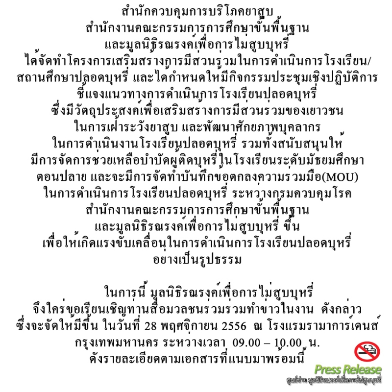 ขอเรียนเชิญท่านหรือผู้แทนร่วมทำข่าวในงานพิธีลงนามบันทึกข้อตกลงความร่วมมือ เรื่องการดำเนินการ โรงเรียนปลอดบุหรี่